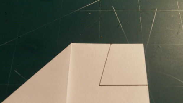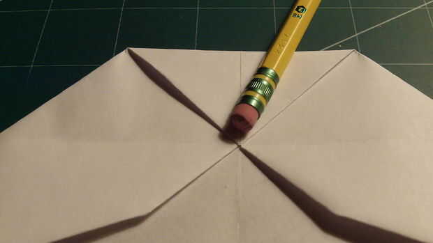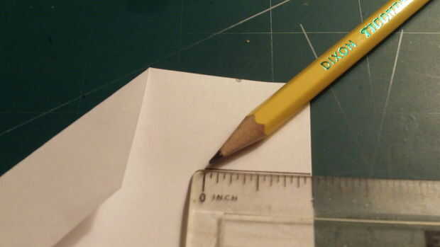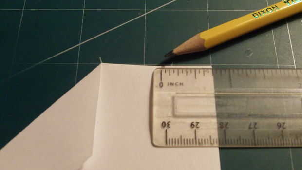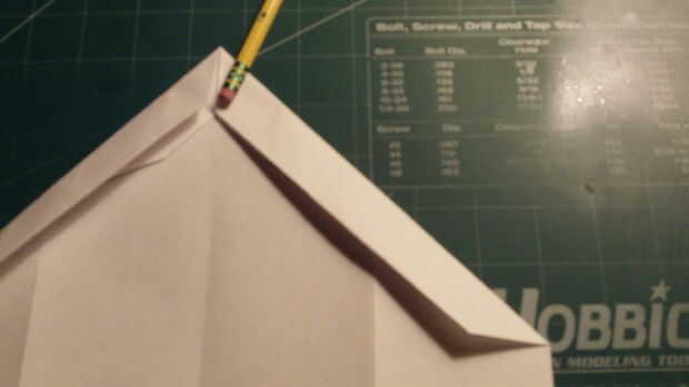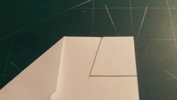 Mide 2,5 pulgadas desde el borde de fuga a lo largo del pliegue del centro, hacer una marca y luego medida 2.5 pulgadas hacia afuera desde el pliegue de centro a lo largo del borde posterior y haga una marca. Luego conecte las dos marcas. Corte a lo largo de esta línea diagonal.