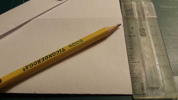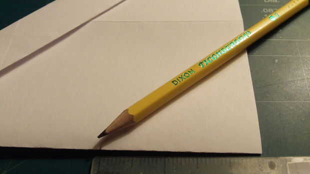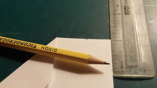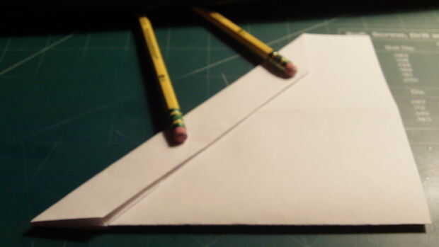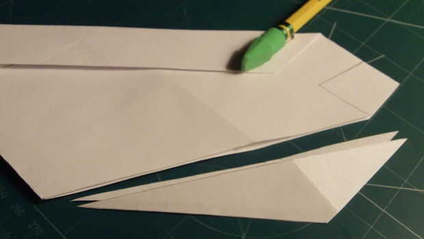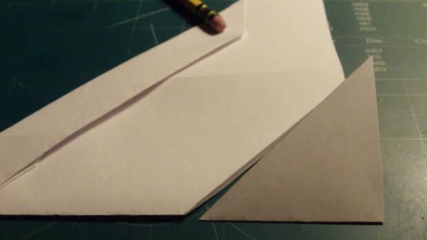 De la marca de 2,5 pulgadas a lo largo del centro de la armadura de avión, conecte una línea para el borde de fuga del ala en el borde de la raíz posterior de las aletas. Luego corte la parte de atrás de esta línea. Entonces puede descartar los asociados trozos de papel.