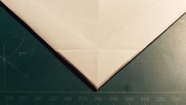 Tome el pedazo de papel que recortar antes y desplegarlo. Doblar las esquinas hacia adentro en cada lado. Luego tire de ellos hacia atrás y hacer un pliegue. Tire hacia atrás como se muestra la capa inferior. Ahora tienes un triángulo más pequeño, más denso. La armadura de avión invertida del tirón y el contrapeso en la parte inferior de la armadura de avión en el borde de la cinta. Esto completará tu Turbo OmniStreak.