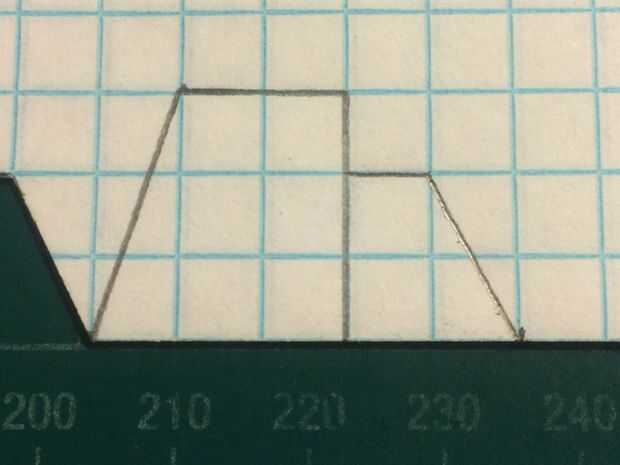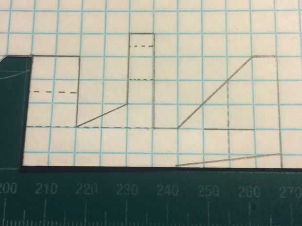 Después de que el fuselaje se hace, tomar otra hoja de papel que se dobla por la mitad a lo largo de las líneas de cajas. Marcar el ala como se muestra (2 cajas de longitud por 3 cajas de ancho y una porción barrida frente a este cuadro de 1 caja eliminaron cada 3 cajas de fuselaje). Adicionalmente, la medida 2 cajas a lo largo del pliegue y 2 cajas arriba de un lado y hacia adelante el 1 cuadro. Luego trace una línea diagonal que conecta esta línea el otro borde de la línea a lo largo del pliegue. Esto hará que los estabilizadores horizontales. Luego recórtalo.