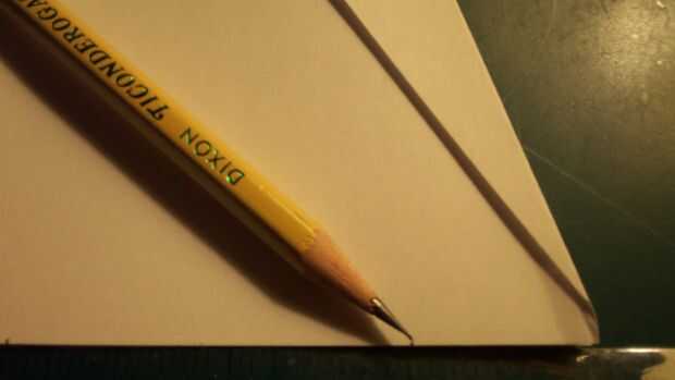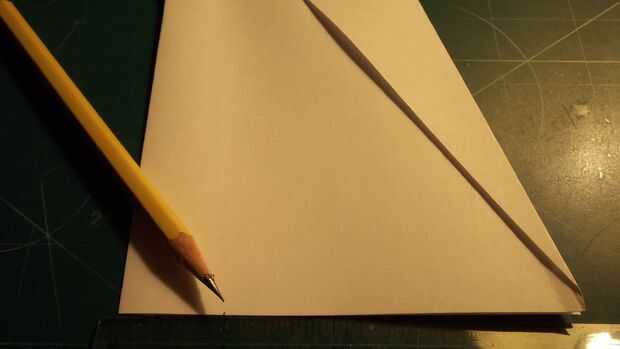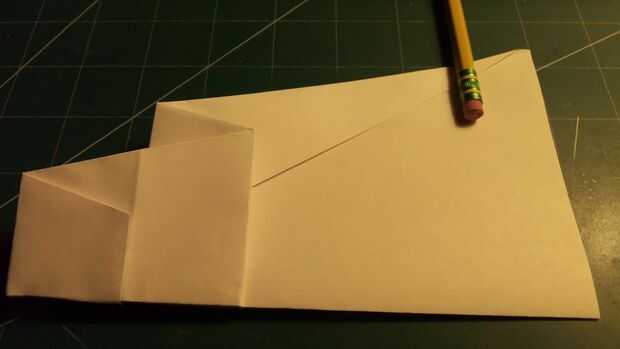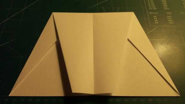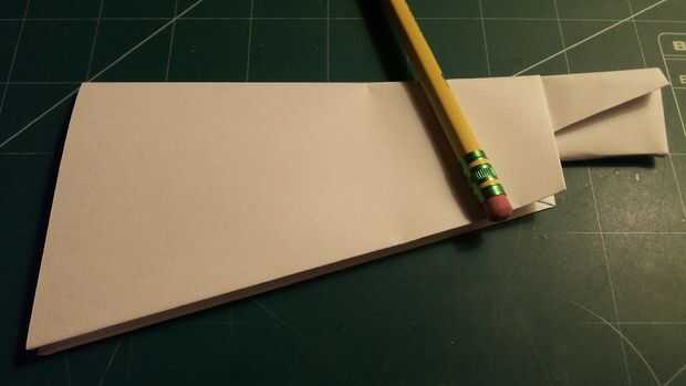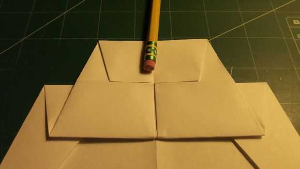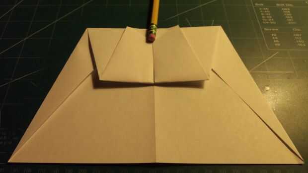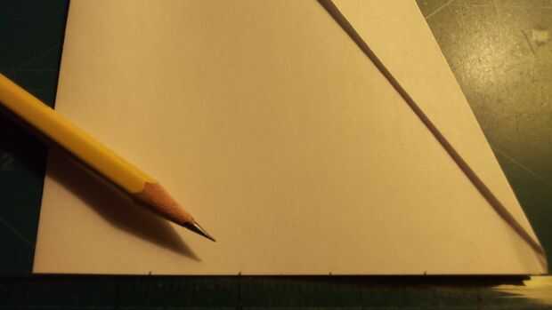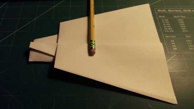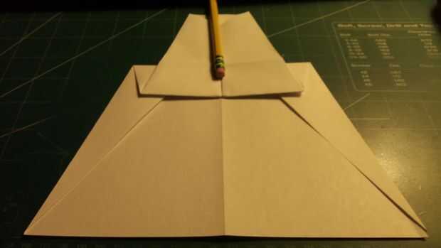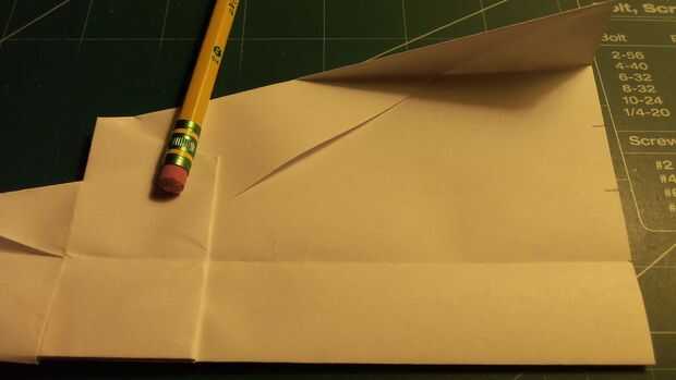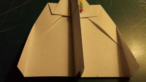 Tirar de la nariz hasta el borde de fuga, y entonces tire la nariz por lo que su punta toque el pliegue que acaba de hacer. Después de hacer esto, tire el pliegue que resulta de este segundo doblez hasta que la primera. Después de hacer esto, tire la nariz a este pliegue. Mide 1 pulgada sobre el pliegue de centro en el fuselaje, luego mide 1 pulgada hacia adentro de los extremos a lo largo de los bordes de fuga/posterior del ala. Mide 0,75 pulgadas desde la marca del doblez de centro a lo largo del borde posterior y haga una marca. De esta marca, medir otro 0,75 pulgadas hacia la punta del ala. De cada una de estas dos marcas anteriores, mida 0,125 pulgadas hacia adentro, hacia la nariz y hacer líneas. Doble las alas hacia abajo en la marca de 1 pulgada, alineando sus bordes de fuga con eso del fuselaje. Asimismo, doblar las Aletillas en su marca de 1 pulgada también. Corte a lo largo de las líneas que hiciste para hacer pequeños elevadores y situado a aproximadamente 10 grados de desviación.