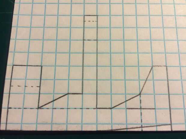 En primer lugar, comenzar por plegamiento eres tu papel milimetrado en la mitad (excepto tres cajas en el lado perforado). Una vez que el papel ha sido doblado adecuadamente, haga dos marcas--11 cajas full apart. Use una regla para hacer una línea recta con una longitud de 10 cajas directamente a 1 fila de cajas de las dos marcas que acaba de hacer. Luego realizar el timón y contrapeso como se indica. Siga las marcas de la fotografía. Luego, marque los largueros de ala y tren de aterrizaje. Por detrás, mida 1 caja hacia adelante y haga una línea sólida larga 2 cajas. Medir 1 caja de principio de línea horizontal y marcar una línea vertical punteada. Una vez que todo está marcado hacia fuera, cortar el fuselaje. A lo largo de la parte inferior del fuselaje, medir 4 cajas de la parte posterior. En la parte posterior, medir cajas de 0,5 por encima de la parte inferior del fuselaje. Haga una línea diagonal que conecta estas dos marcas.
