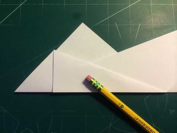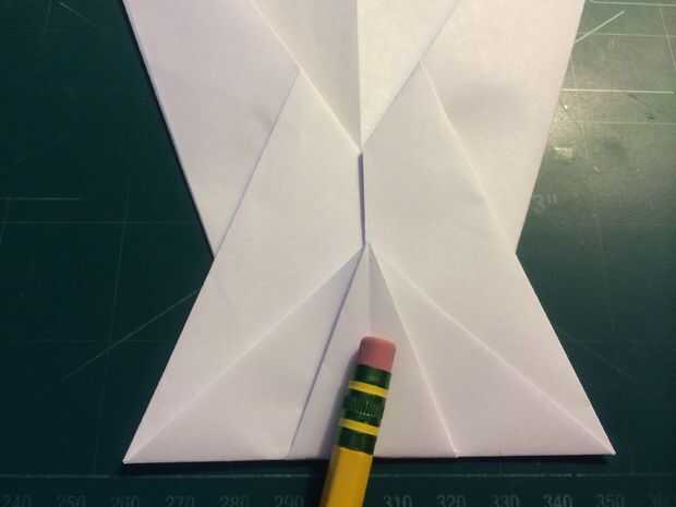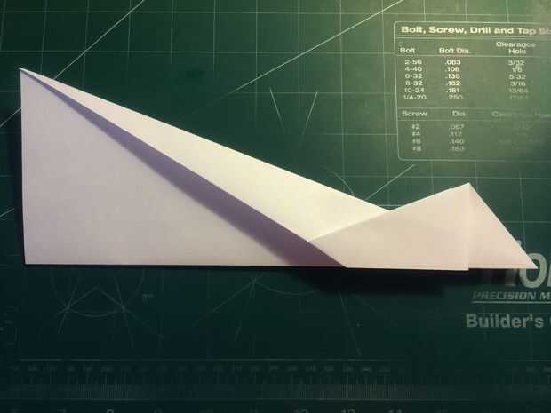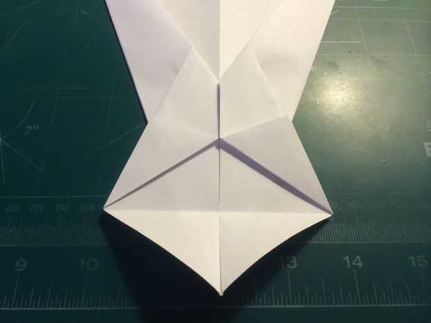 Dobla tu papel por la mitad lo largo. Luego tire del papel hacia abajo para que el pliegue se extiende desde el pliegue en la parte delantera que acaba de hacer y la esquina del papel en el otro lado. Repita en el otro lado. Cuando esto haya terminado, tire del papel saliente hacia atrás sobre el pliegue de centro anteriores. Doblar la superficie de sustentación sobre sí mismos y luego de nuevo en sí mismos como se muestra. Doblar los bordes de estas secciones por sobre el pliegue de centro como se muestra, luego tire la punta triangular de la nariz hacia atrás sobre ellos. Después de hacer esto, abra la tapa de la nariz como se muestra, luego hacer los dobleces como