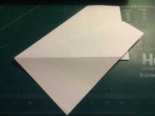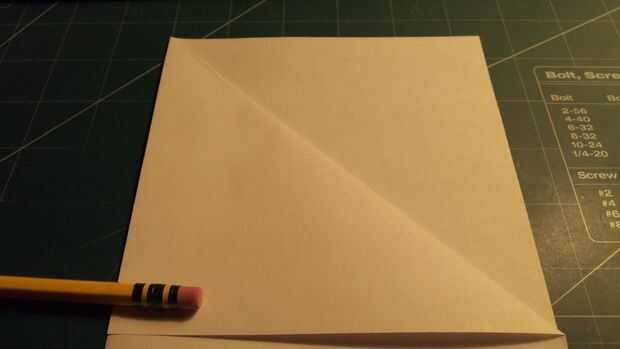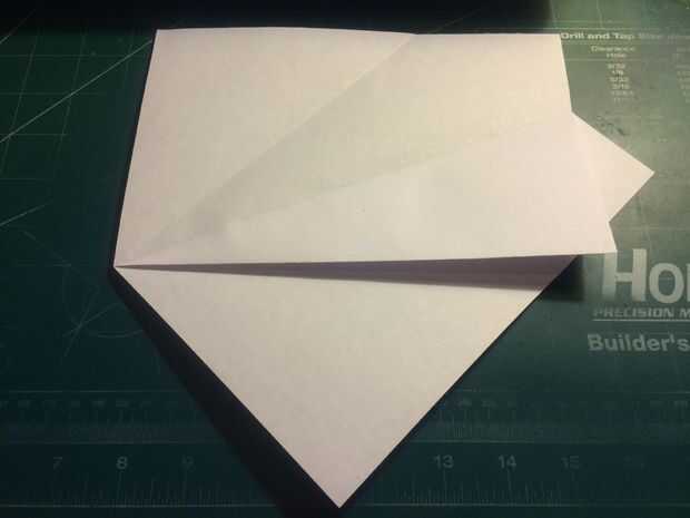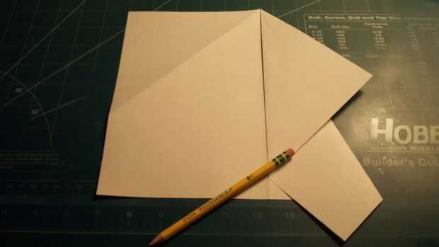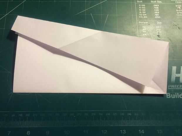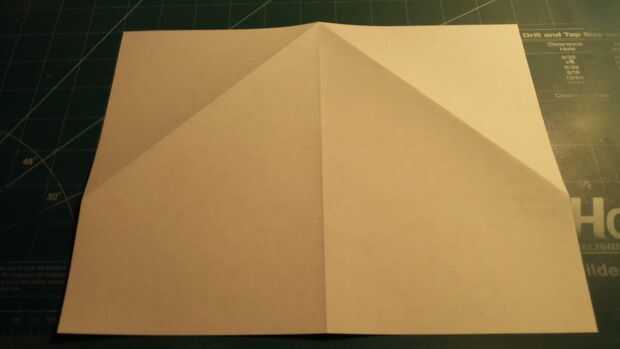 Dobla el papel por la mitad a lo largo de su anchura. Luego en una de las mitades, doblar la esquina hacia abajo para el doblez del centro. Repita en el otro lado. Una vez que se han establecido los pliegues, se despliegan cada uno. Luego doblar los pliegues del papel en sí mismos, como se muestra. Luego doblar nuevamente. Una vez terminado esto, desdoble el papel. Tire los dobleces de esquina sobre el pliegue del centro y que puedan permanecer allí. Despliegue y tire el borde externo en el pliegue que hace con el doblez anterior. Repita en el otro lado.