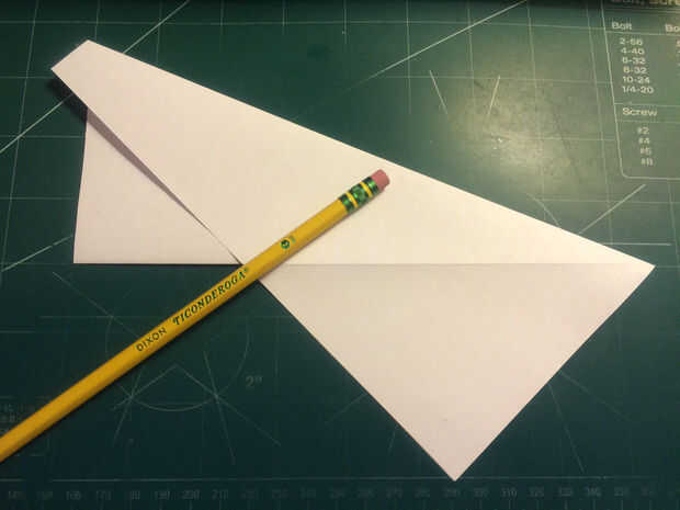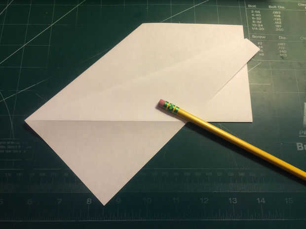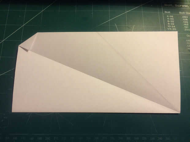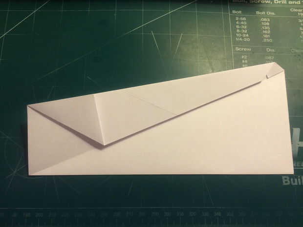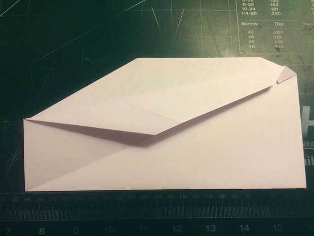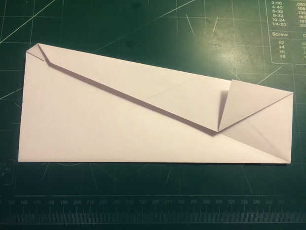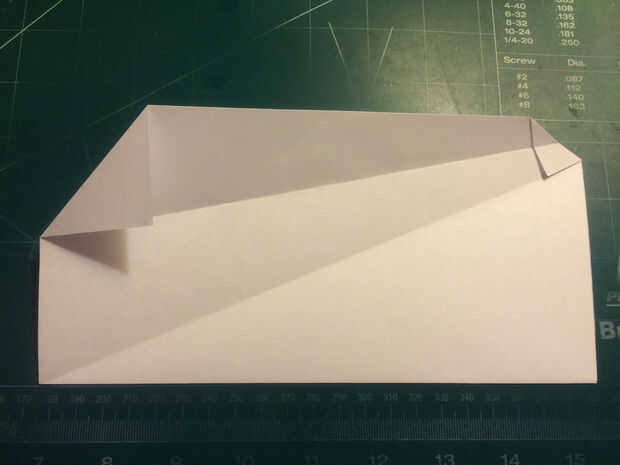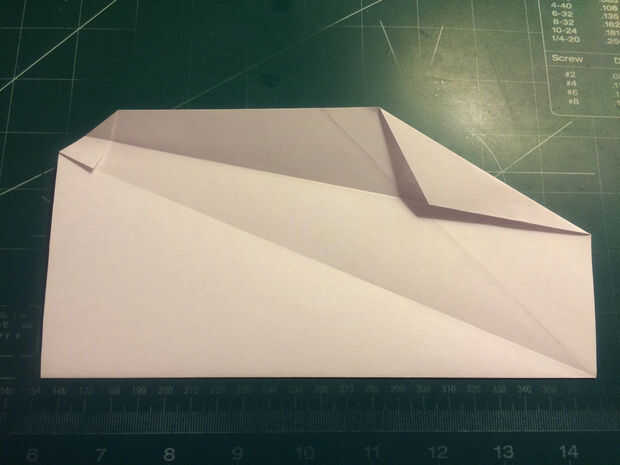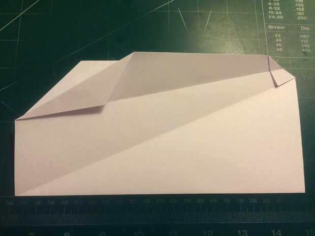 Doblar los pliegues de los pliegues de la esquina hasta el pliegue del centro. En la parte posterior del papel, doblar la punta del papel hacia el pliegue de cada lado como se muestra. Doblar los bordes del papel en los pliegues que ha hecho con los pliegues anteriores. Después de hacer esto, doblar las esquinas del papel a los bordes de cada lado como se muestra, entonces despliegan y tire sus bordes en sus pliegues, una vez más. Meta el papel poco después. Después de esto, doble los pliegues los pliegues hacia abajo sobre la parte superior de los mismos. Continúe plegar el papel a lo largo de los pliegues hasta que su papel coincide con la última fotografía para crear las superficies de sustentación.