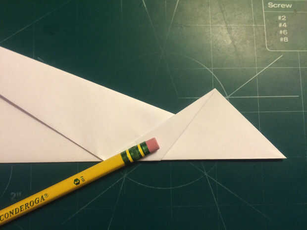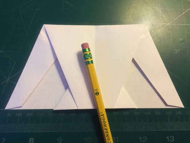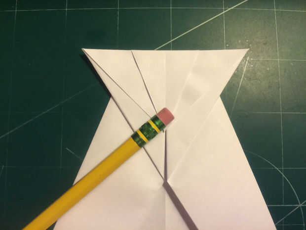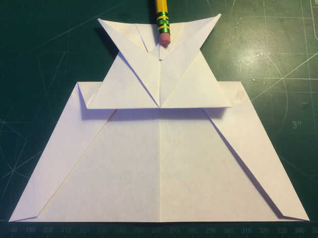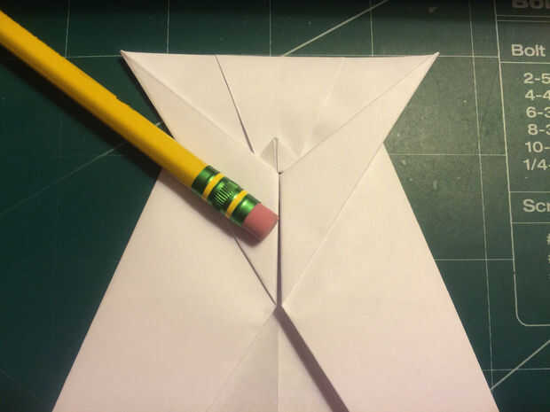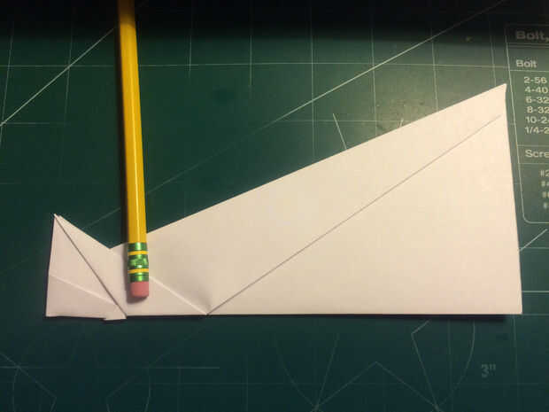 Plegar los canards en cada lado manteniendo sus bordes de ataque paralelo de la nariz. A lo largo del borde de fuga, medida de 1 pulgada por encima del pliegue del centro y haga una marca. En esta marca, dobla las alas
