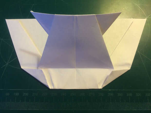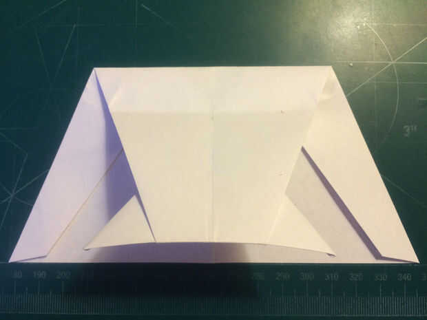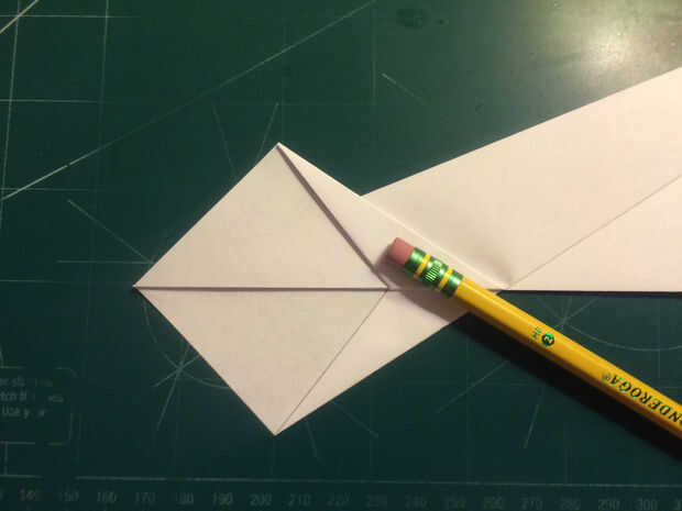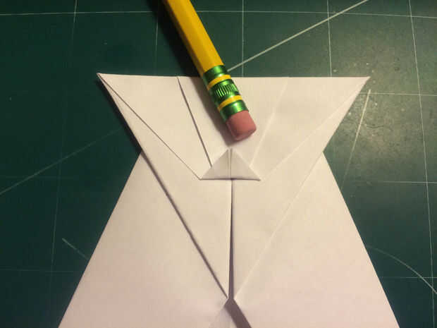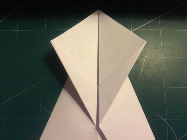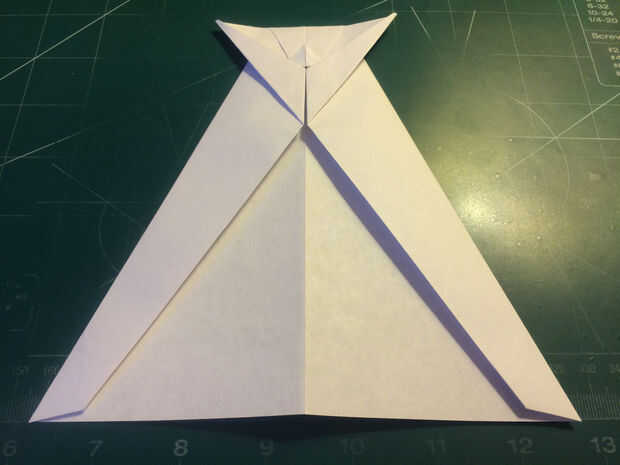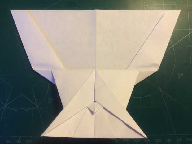 El avión del doblez por la mitad a lo largo del pliegue del centro y la nariz hasta el borde de fuga del doblez como se muestra. Apriete la nariz vuelta hacia adelante hasta que se alcancen los traseros de los estabilizadores. Pliegue de la nariz de nuevo a los bordes de fuga, luego doblar las esquinas para el pliegue existente por el plegamiento de la nariz. Una vez finalizado esto, tirar de la nariz sobre estos pliegues.