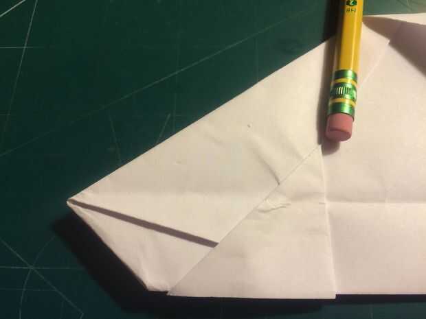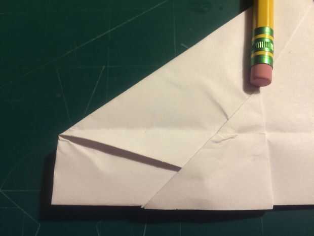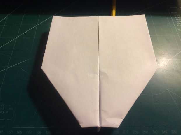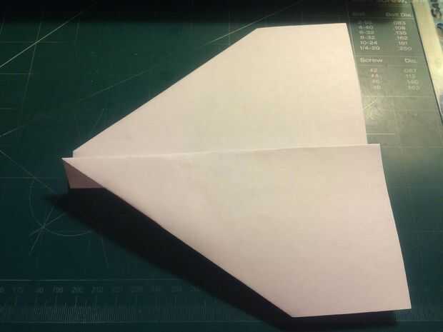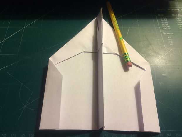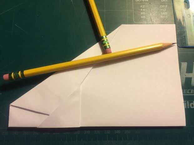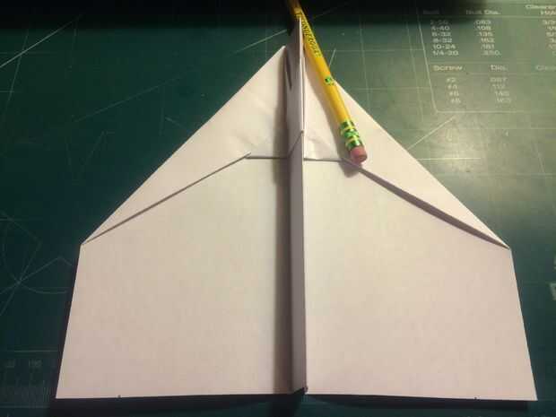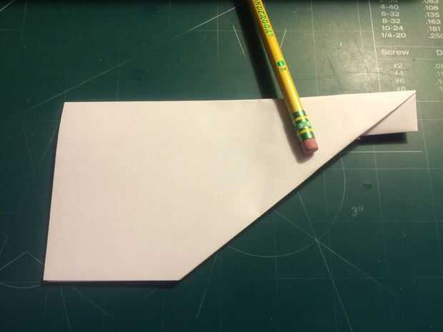 Medir 0,875 pulgadas por encima del pliegue del centro a lo largo de los bordes de fuga/posterior de las alas y haga una marca. Una vez hecho esto, mida 0,875 pulgadas de los extremos del ala a lo largo de los bordes de fuga/posterior de las alas y hacer marcas. Después de hacer estas marcas, pliegue las alas hacia abajo en la primera boya. Mantener un ángulo de incidencia de cero grados, alineando los bordes de fuga de las alas con el fuselaje. Una vez que las alas se doblan, pasemos a las aletillas. Plegar en las segunda marcas realizadas; Alinee los bordes de fuga con las de las alas para mantenerlos paralelos con el fuselaje.