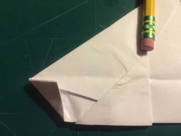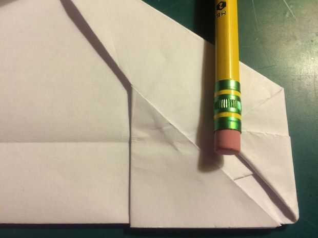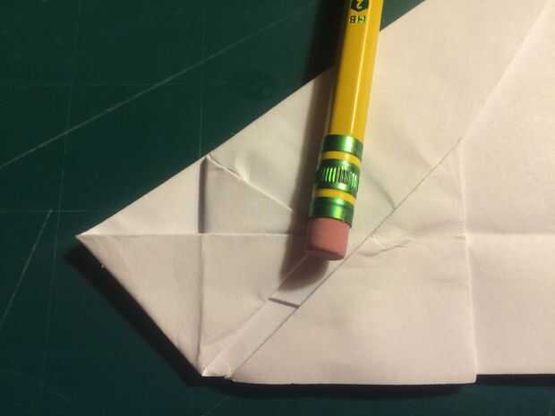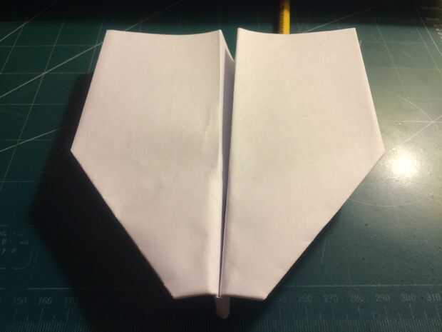 Doblar el borde del fuselaje hasta los pliegues de la raíz de ala, luego meter el papel en el fuselaje como se muestra. Una vez hecho esto, tire del papel hacia atrás como se muestra. Luego doblar las alas hacia abajo. El doblez en la parte delantera Trabe la nariz. Cinta de designado. Esto completará la aeronave.