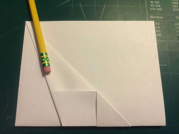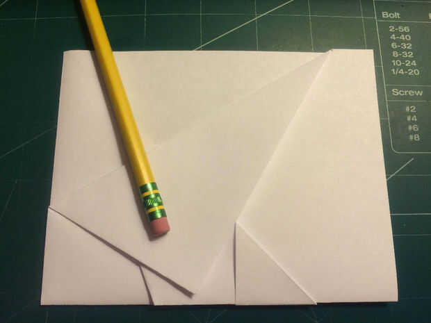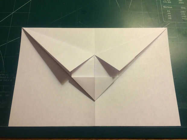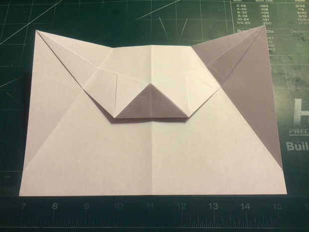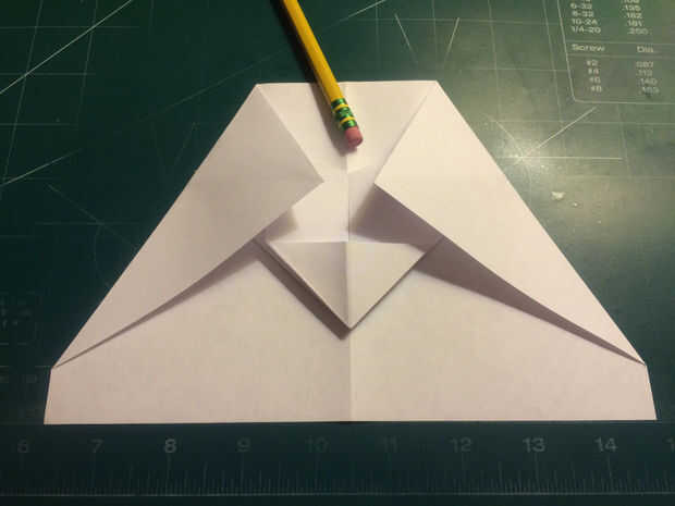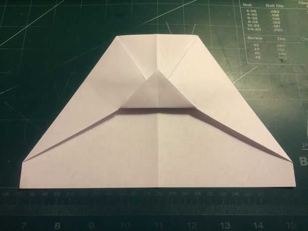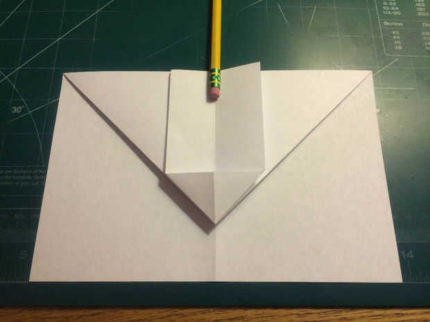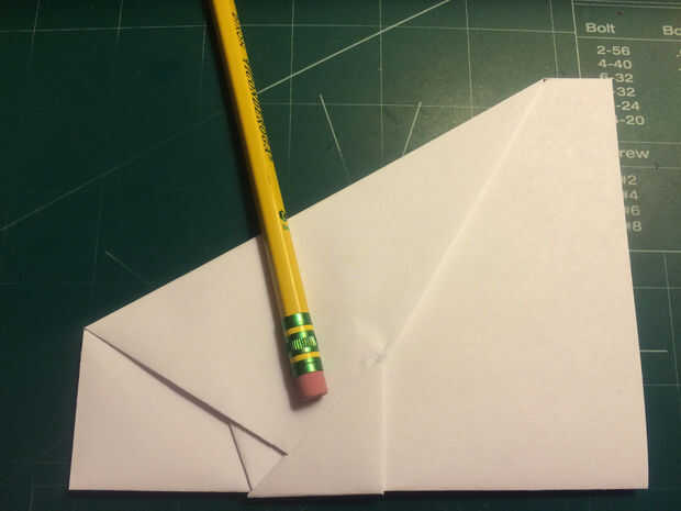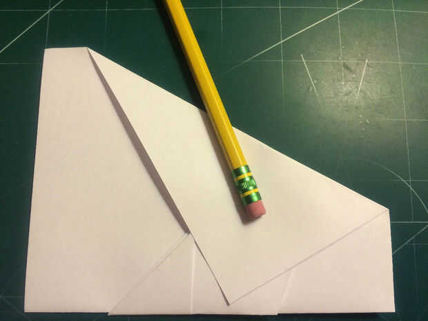 Doblar los bordes delanteros de los dobleces de seguridad hasta los pliegues, luego doble el papel hacia atrás por debajo de sí mismo. Dobla el avión la mitad y luego medir 0,75 pulgadas hacia adelante del borde de fuga a lo largo de los bordes de las alas. Medir 1,5 pulgadas desde el pliegue de centro a lo largo del borde principal de la aeronave y haga una marca. Conecte las dos marcas con pliegues. Tire de la tapa de seguridad hacia adelante a lo largo de borde recto del triángulo. Doble superficie de sustentación en los bolsillos de la tapa de seguridad.