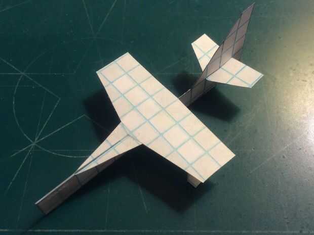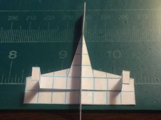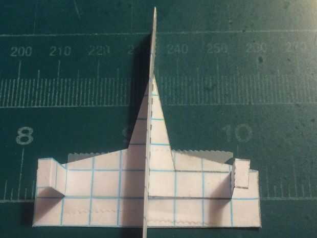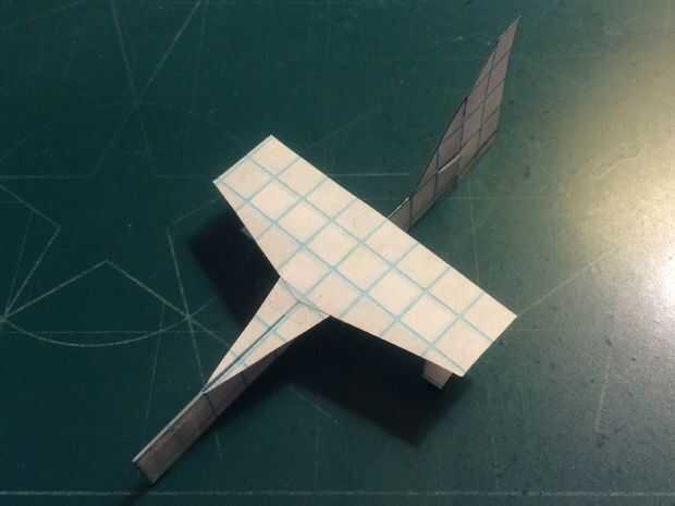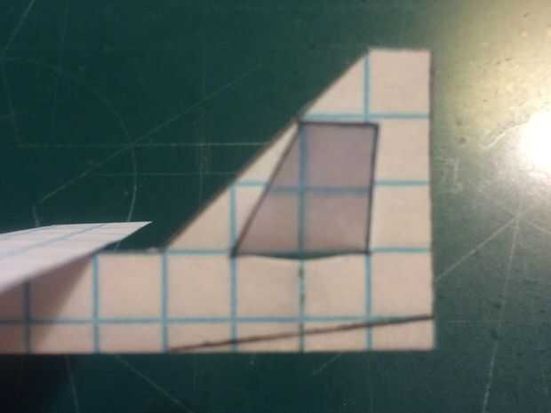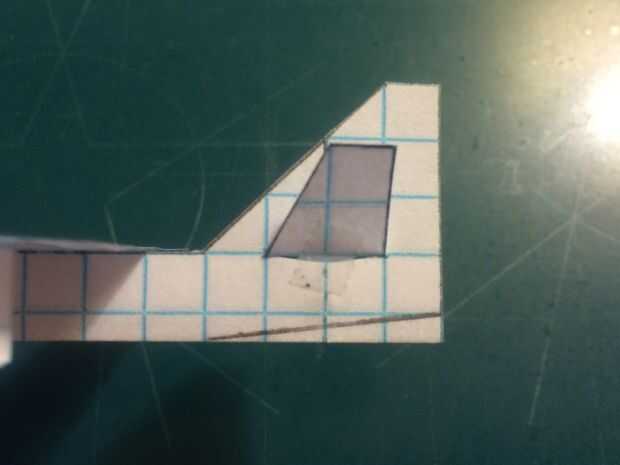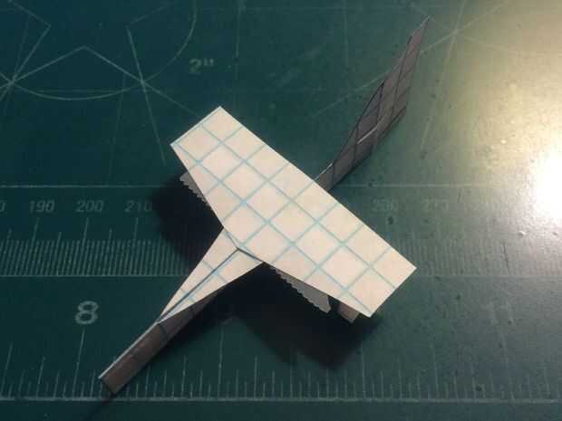 Una vez que ha terminado con las alas, cortar sus estabilizadores horizontales y deslícelos a través de la abertura en el fuselaje que formuló. Cuando a través, doble hacia arriba y aplique la cinta en la parte inferior; luego doble hacia abajo.