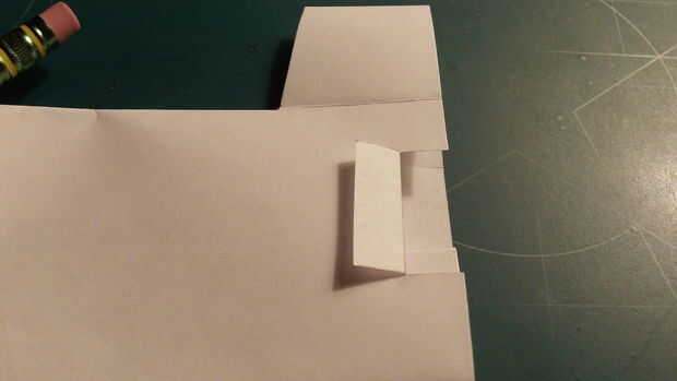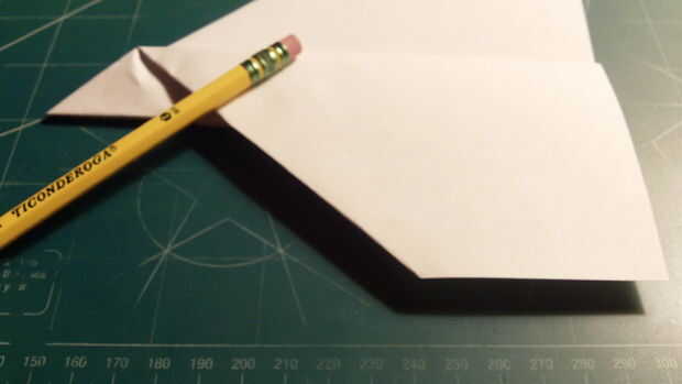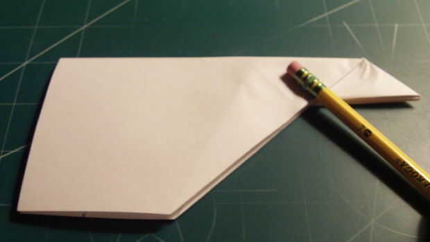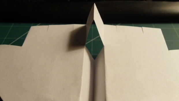 Una vez que hayas cortado los elevadores, tire de la aleta del centro hacia arriba y a través del fuselaje mientras dobla las aletas del estabilizador hacia abajo. Luego doblar los ascensores.