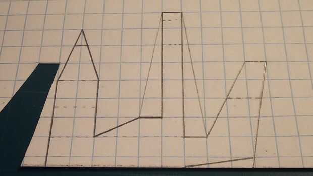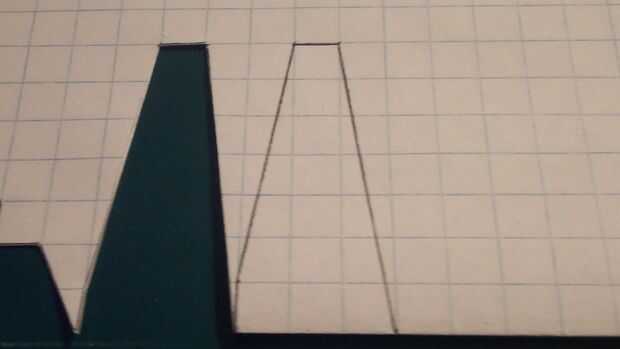 Después de que el fuselaje se hace, tomar otra hoja de papel que se dobla por la mitad a lo largo de las líneas de cajas. Marcar el ala como se muestra (1 caja de constante acorde a la raíz, un barrido de vanguardia de 1 caja de acorde que se decae cada 6 cajas hacia afuera de la caja acorde constante;) y un borde posterior barrido de 1 caja de decadencia a lo largo de las 7 cajas de envergadura. Esto completa las alas.