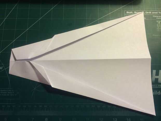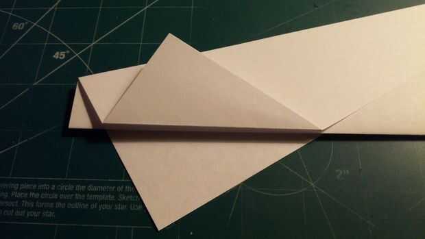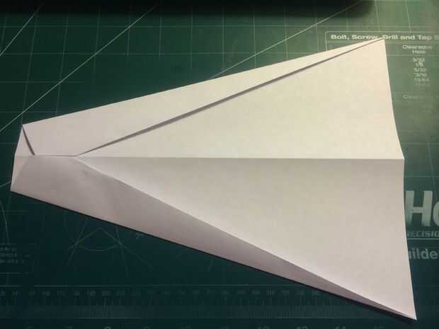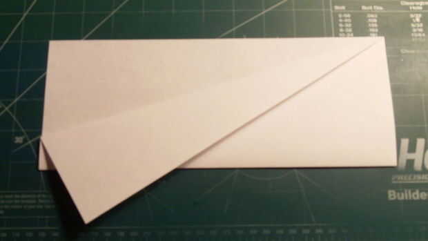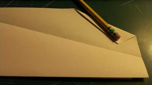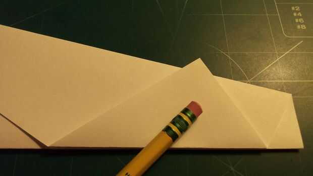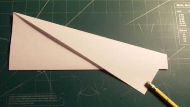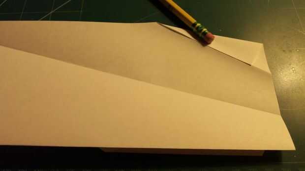 Dobla tu papel por la mitad lo largo. Haga una marca de 1 pulgada por encima del pliegue del centro a lo largo de la parte frontal del papel. Luego tire del papel hacia abajo para que el pliegue se extiende desde la marca que acaba de hacer y la esquina del papel en el otro lado. Repita en el otro lado. Pon las piezas que sobresalen sobre las otras partes de los pliegues de la superficie de sustentación y entonces estos doble como se muestra. Meter estos pliegues debajo de la superficie de sustentación como se indica. Luego voltear y meter los perfiles mismos como se muestra.