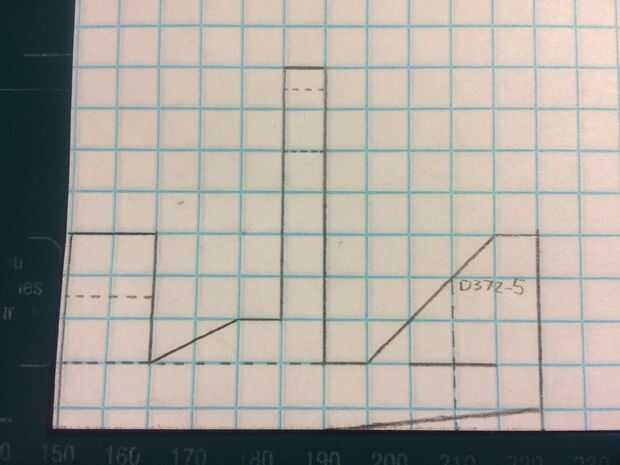 En primer lugar, comenzar por plegamiento eres tu papel milimetrado en la mitad (excepto tres cajas en el lado perforado). Una vez que el papel ha sido doblado adecuadamente, haga dos marcas--11 cajas full apart. Use una regla para hacer una línea recta con una longitud de 10 cajas directamente a 1 fila de cajas de las dos marcas que acaba de hacer. Luego realizar el timón y contrapeso como se indica. Siga las marcas de la fotografía. Luego, marque los largueros de ala y tren de aterrizaje. Por detrás, mida 1 caja hacia adelante y haga una línea sólida larga 2 cajas. Medir 1 caja de principio de línea horizontal y marcar una línea vertical punteada. Una vez que todo está marcado hacia fuera, cortar el fuselaje. A lo largo de la parte inferior del fuselaje, medir 4 cajas de la parte posterior. En la parte posterior, medir cajas de 0,5 por encima de la parte inferior del fuselaje. Haga una línea diagonal que conecta estas dos marcas.