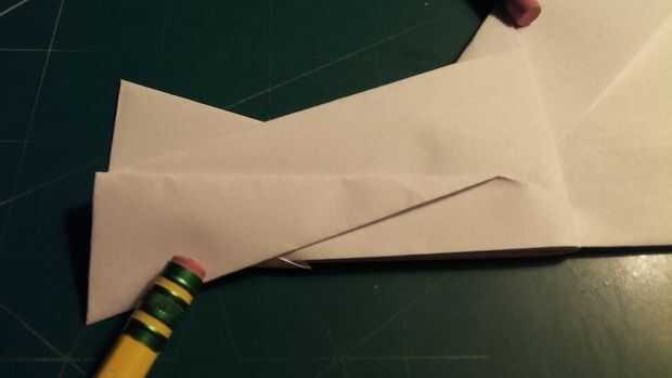Comenzar este paso tirando hacia atrás de la nariz hasta el borde de la nariz toque el borde de fuga del ala. Haga una marca de 1 pulgada en de este redil. Luego invierta el doblez hasta esta marca y hacer un pliegue como se indica. Desplegar este nuevo pliegue, luego tire de los extremos hacia adentro como se muestra. Una vez que se doblan una vez vuelva a tirar la nariz adelante. Cuando esto esté hecho, doble el fuselaje por la mitad a lo largo del pliegue del centro. Después de hacer esto, abra la tapa de la nariz como se muestra, luego hacer los dobleces como en la imagen. Inserte estos en sí mismos, entonces en la aleta de la nariz como se doblan hacia abajo otra vez. Doble hacia abajo las canards mientras mantienen sus bordes principales alineados con la nariz para mantener un ángulo de incidencia de cero grados. Hacer marcas de 1 pulgada desde el pliegue de centro y 1 pulgada de la punta del ala a lo largo del borde posterior del ala. Después de esto, plegar las alas en la marca que hiciste anteriormente. Alinee los bordes de fuga de las alas con eso del fuselaje para mantener el ángulo de incidencia a cero grados. Después de que esto termine, doble los extremos hacia abajo en las marcas realizadas anteriormente.