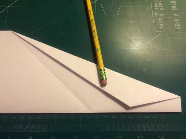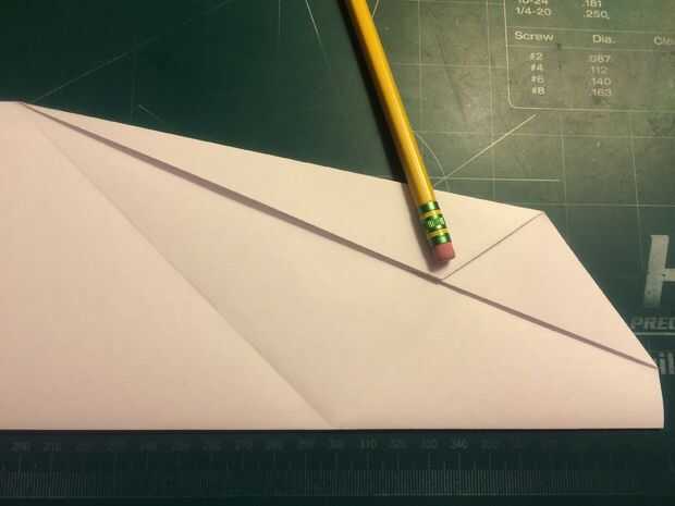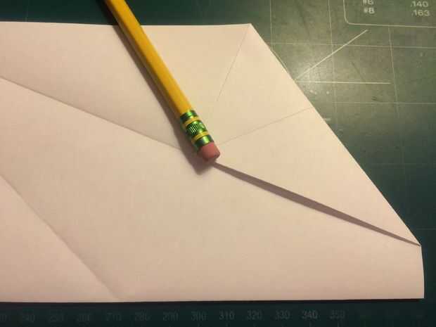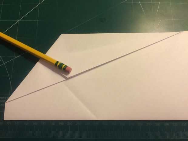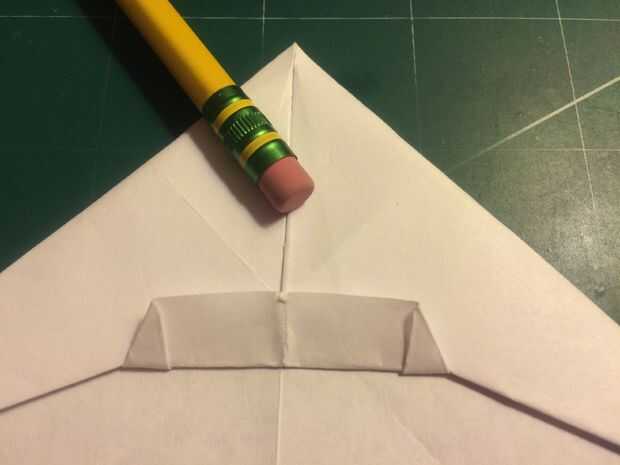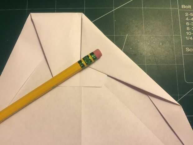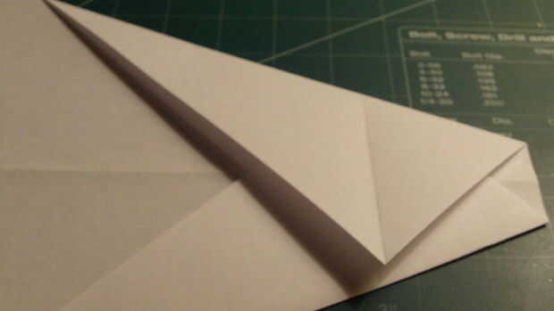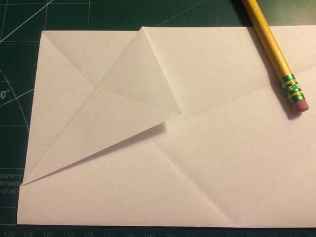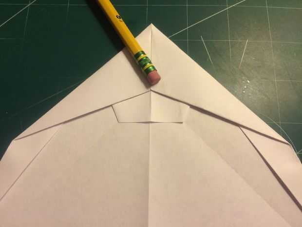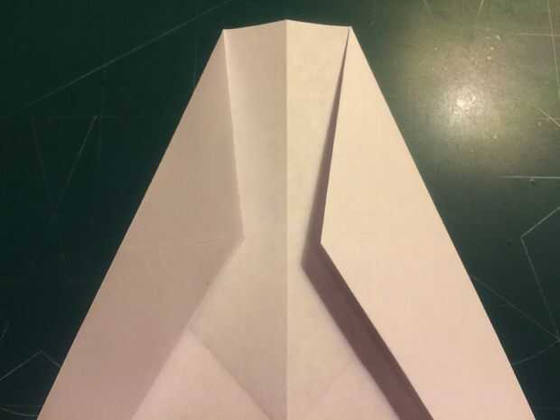 Pliegue de la nariz hacia abajo a lo largo de los dobleces establecidos. Tirar de las esquinas de la Roma ahora punta de la nariz hacia adentro, hacia el pliegue del centro. Una vez que ambas esquinas han sido doblados, tire hacia delante la tapa de seguridad para bloquear los perfiles.