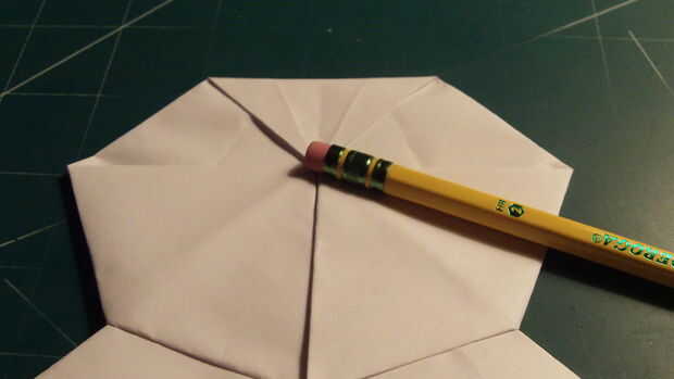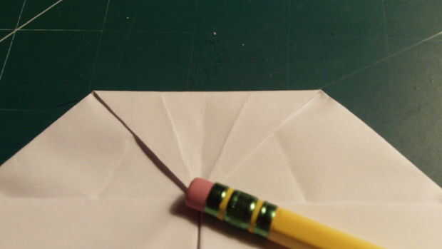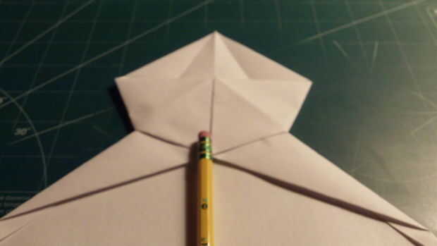 Tire de la punta de la nariz a la parte delantera de la parte inferior de la canard. Al terminar, doblar el avión por la mitad a lo largo de su centro.