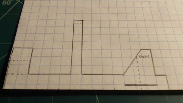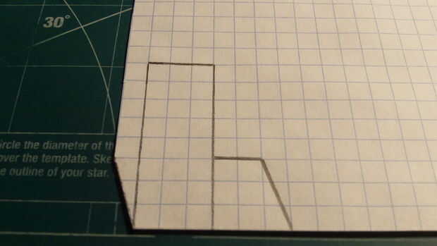 En primer lugar, comenzar por plegamiento eres tu papel milimetrado en la mitad (excepto tres cajas en el lado perforado). Una vez que el papel ha sido doblado adecuadamente, haga dos marcas--15 cajas full apart. Use una regla para hacer una línea recta con una longitud de 15 cajas directamente a 1 fila de cajas de las dos marcas que acaba de hacer. Luego realizar el timón, palos, aterrizaje y contrapeso como se indica. Siga las marcas de la fotografía. Entonces, bajo el timón, marque una línea que se extiende 3 cajas. cajas de 1,5 desde el comienzo de esta línea, hacer una línea de puntos vertical. Una vez que todo está marcado hacia fuera, cortar el fuselaje.