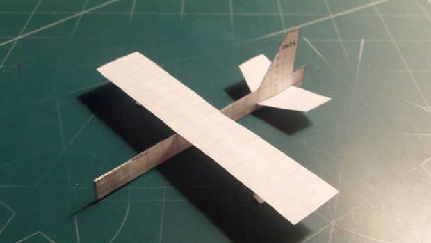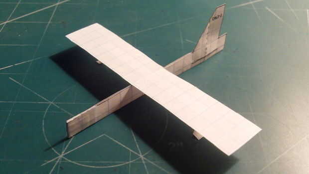Ahora es el momento para trabajar con el ala de la Voyager. Cortar el ala y desplegarlo. Su fuselaje invertido del tirón y aplique la cinta a los largueros. Entonces Únete a ala y el fuselaje en los largueros. Entonces puso sus estabilizadores horizontales a través de su punto de anclaje determinado. Doble hacia arriba y luego aplicar la cinta en su parte inferior, colocar en el fuselaje. Una vez hecho esto, aplicar una grapa a cada lado del contrapeso.