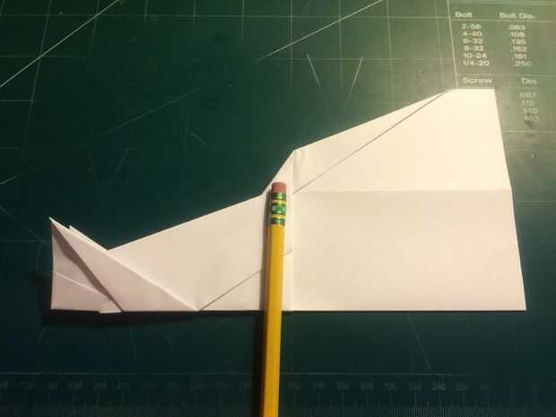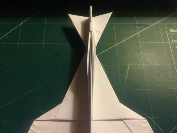 Doble su avión de papel por la mitad a lo largo de su centro. Doble los canards hacia abajo como se muestra, alineando su borde de ataque con el fuselage mantenga un ángulo de incidencia de cero grados. Doble las alas hacia abajo en los pliegues existentes previamente. Después de esto se ha completado, doblar cada winglet en los pliegues. Después de las aletillas, aplique cinta de designado. Esto completará tu WarVulcan.