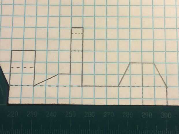 En primer lugar, comenzar por plegamiento eres tu papel milimetrado en la mitad (excepto tres cajas en el lado perforado). Una vez que el papel ha sido doblado adecuadamente, hacer dos marcas--11 cajas completos apart (permite un cuadro más detrás de la armadura de avión). Use una regla para hacer una línea recta con una longitud de 12 cajas directamente a 1 fila de cajas de las dos marcas que acaba de hacer. Luego realizar los estabilizadores, largueros y contrapeso como se indica. Para evitar confusiones, se ha omitido una línea que se corta a lo largo de la fotografía.