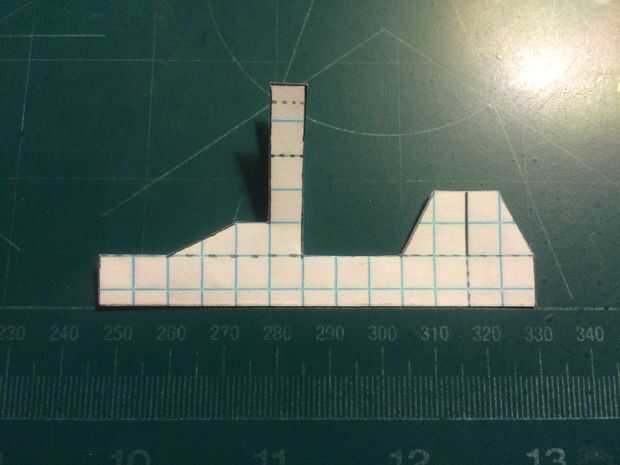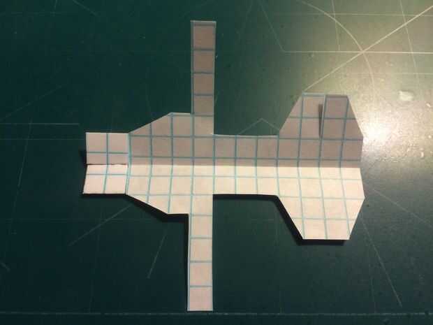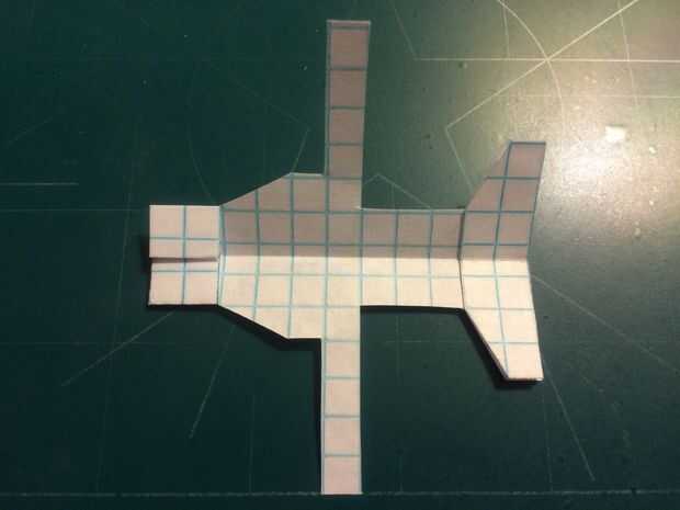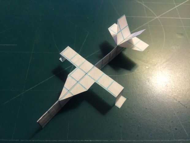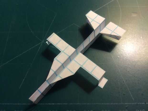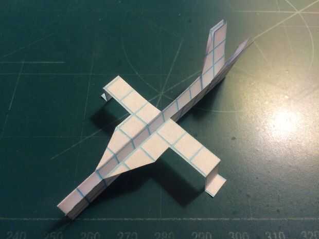 Cortar el fuselaje y doblar sus contrapesos en su lugar. Corte a lo largo de las líneas sólidas. Una vez hecho esto, doblar a lo largo de la línea de puntos vertical entonces doblar el avión por la mitad a lo largo del pliegue de centro una vez más. Doble a lo largo de las líneas horizontales punteadas y luego cinta adhesiva donde se indica.