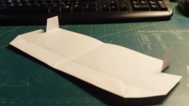 Se trata de una manera simple y rápida de un avión de papel del doblez. Es rápido, puede resistir un tiro de fullforce y no necesita mucho de calibración. Pero también es muy frágil.Paso 1: Dobla el papel por la mitad lateral.Paso 2: Dobla el papel p