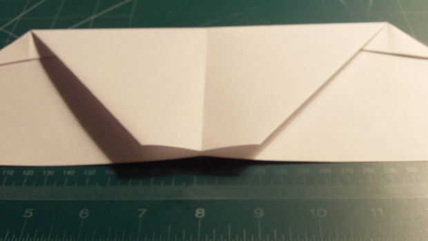 Revelar su papel para que sea en una orientación de anchura la mitad de veces. Luego, jale las esquinas en el centro, donde se unen los pliegues de media anchura y longitud. Luego doblar la parte delantera hasta la parte posterior. Establecer un pliegue y luego deshacer el doblez. Doblar la parte delantera para el pliegue que hizo, hacer un pliegue y despliegue. Luego doblar la parte delantera para pliegue. Luego dobla el papel hacia abajo sobre sí mismo 3 veces más. Cuando haya terminado con este proceso, el documento debe aparecer como se muestra en la última fotografía.