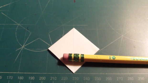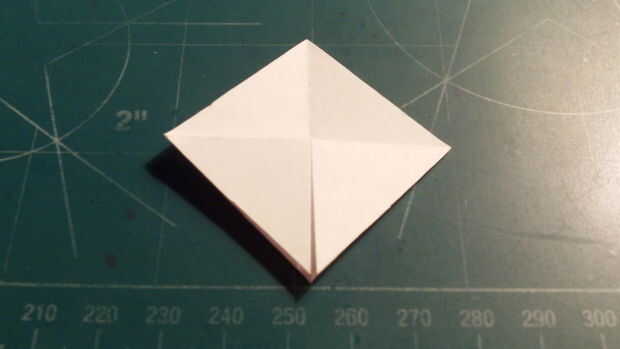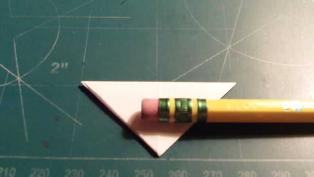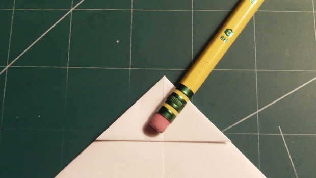 Desplegar el triángulo usted hizo anteriormente cuando usted prepara el contrapeso. Tire de cada una de las esquinas hacia adelante hasta la punta frontal. Luego vuelta el papel verticalmente y tire del papel hacia atrás, hacia su propio pliegue y luego hacer un pliegue perpendicular como se muestra. Tire el resto una capa sobre el resto del papel. Tomar la armadura de avión y darle la vuelta invertida. Coloque el contrapeso en la parte delantera de la aeronave. Proceda al contrapeso triangular a la nariz del aeroplano de la cinta como se muestra. Una vez hecho esto, voltee el aeroplano y desplegar las aletas verticales. Su Simple Omniwing está ahora completa.