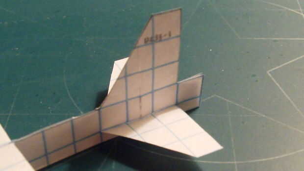 Poner sus estabilizadores horizontales a través de su punto de anclaje determinado. Doble hacia arriba y luego aplicar la cinta en su parte inferior, colocar en el fuselaje.