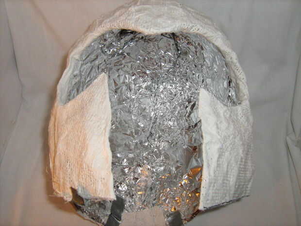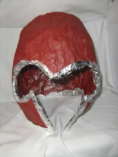 Ahora, para este paso he utilizado tiras de yeso de París, pero papel maché probablemente tendría un aspecto más agradable. cubrir el casco en papel maché y espere que se seque. Después de eso, pintura roja.