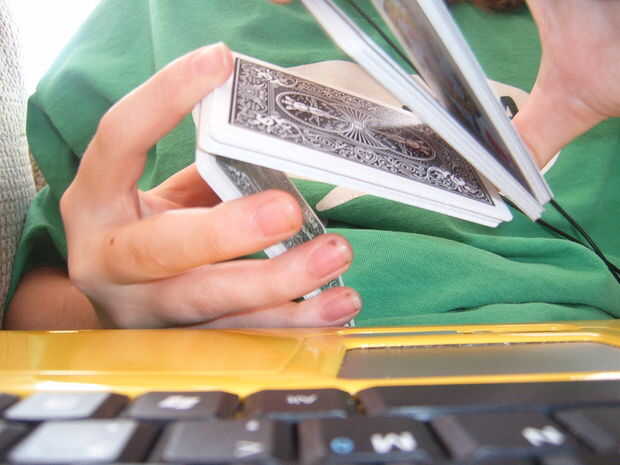 Ahora necesitas dividir el paquete superior de tarjetas por la mitad con usted está dedo índice. Paquete de clip inferior bajo.