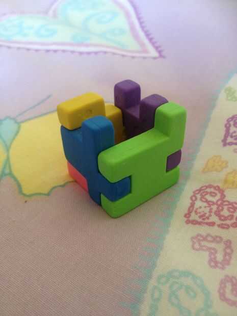 esto es una especie de cubo del rompecabezas. Hizo ver lo que podía hacer con el uso de cosas muy normales. Son todo tipo de formas que se ajustan en el cuadro como se muestra en la fotografía. Dio como un regalo para un intercambio de regalos.Paso 1
