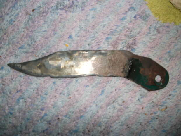 Poner el corte básico en un tornillo de banco y usar el disco duro en su amoladora de ángulo (o una lima de metal si te gusta) para cortar el exceso del metal por el perfil de la hoja. Esto debería ser bastante fácil sólo estás cortando una forma pero si se utiliza una lima de metal esto llevará mucho tiempo y será muy frustrante. Los diferentes colores que aparecen en el borde son sólo productos de los cambios de bajo nivel de calor en el acero y no comprometen su fuerza o acabada mirada. Recuerde que estos colores que va a utilizarles a su ventaja más adelante cuando heat-treat el cuchillo. Ver imagen dos abajo para una acción de tiro y tres para la cuchilla de corte-hacia fuera completamente.