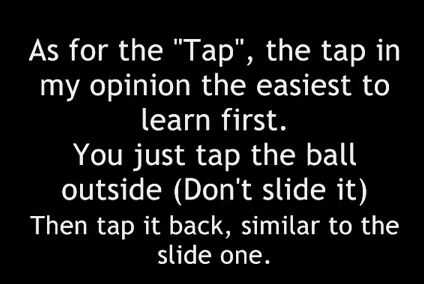 Diapositiva: Por otro lado, correderas es más difícil de aprender; pero más fácil de retirar una vez su Sprint o movimiento rápido. De la diapositiva, tienes que "Arrastrar" la bola hacia afuera diagonalmente (similar al toque). (como empujar una pelota con las piernas en lugar de patearlo), y luego traer de vuelta pisando fuerte y cambiando los ángulos de su pie.