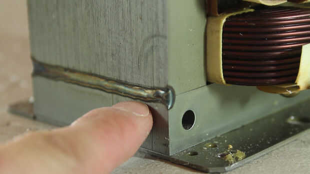 El núcleo del transformador sólo se mantiene unida por 2 soldaduras muy finas, como se ve en el lado este.