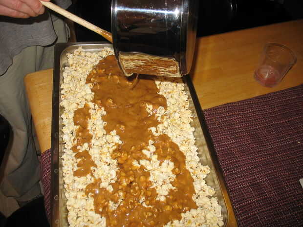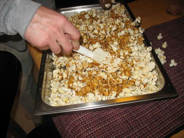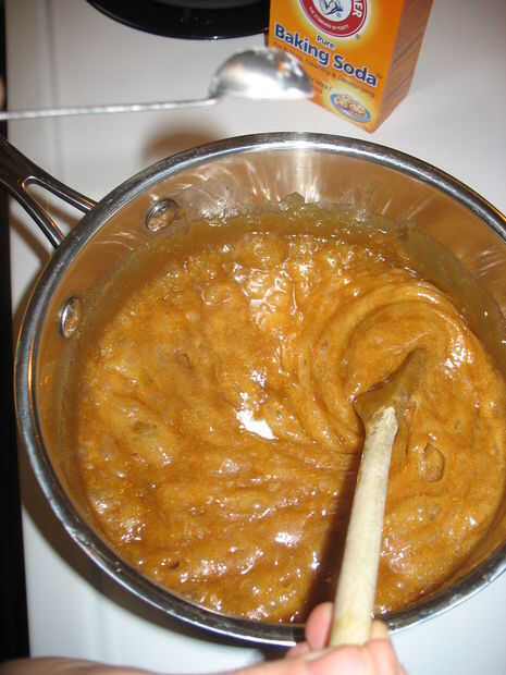 Combinar el azúcar morena, mantequilla, jarabe de maíz y sal. Una vez todo fundido, gooey bondad a hervir y mantener el hervor durante 5 minutos. Retirar del fuego y añadir el bicarbonato de sodio (esto hará que la mezcla de la espuma). Seguir revolviendo mientras la espuma se construye. A continuación se vierte uniformemente sobre el maíz hecho estallar. La mezcla así como usted puede... no te preocupes acerca de la cobertura total, incluso hacia fuera en el paso siguiente.