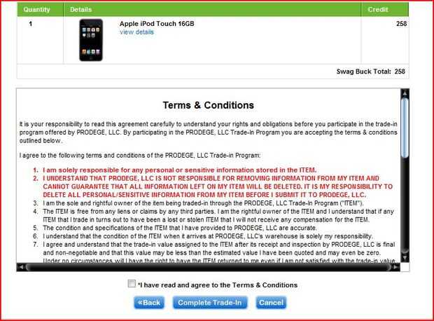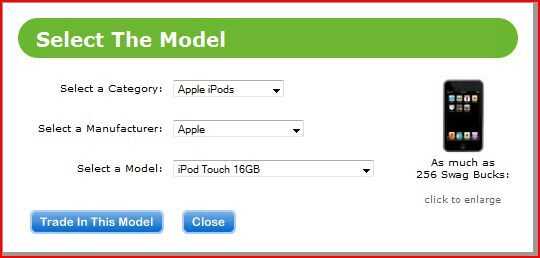 enlace de la cuenta especial cuando gané, se ganar y cuando ganas, gano. es como un doble contrato. a swagbucks.com básicamente pagan que utilice su motor de búsqueda, que es un combo entre google y pida. Obviamente, usted puede ganar swag bucks de otras maneras, que estoy describiendo ahora. a continuación, en el lado izquierdo, haga clic en teléfonos móviles y reproductores de mp3 de comercio pulg haga clic en reciclar. Haga clic en empezar. Llene el formulario según tu ipod, luego haga clic en siguiente. prensa comercio en este modelo. Compruebe lo que usted tiene que también el comercio, a continuación, haga clic en siguiente. de acuerdo a términos y condiciones, luego prensa completa comercio pulg si es tu primera vez con ellos, a pedir su dirección envíe el sobre prepagado. onve usted conseguir los sobres, siga las instrucciones y colóquelo de nuevo en el buzón. Dependiendo de qué tipo de forma que el ipod es en van a reventa, o cuidadosamente lo desarma y reciclar cada parte en su propio recipiente especial.