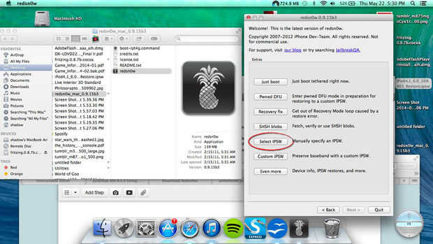 Una vez que hayan descargado el redsn0w y el firmware, tanto para el escritorio para fácil acsess arrastre. Abra la carpeta redsn0w y verás cinco archivos y aplicaciones. Abre la aplicación redsn0w. Ahora Conecte su i dispositivo al ordenador utilizando el cable.