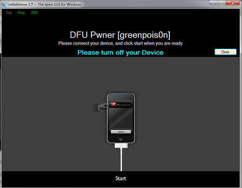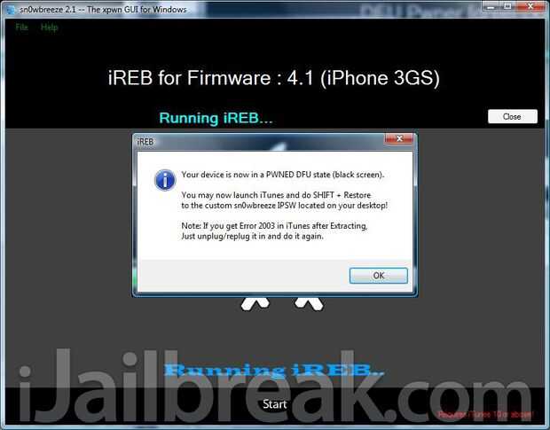 Después de eso, un windows deben saltar que se titula "sn0wbreeze-2" y dice "el dispositivo está ahora en estado PWNED DFU (pantalla negra)", etc.. Simplemente haga clic en Aceptar.