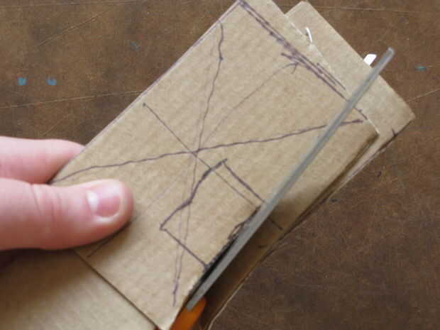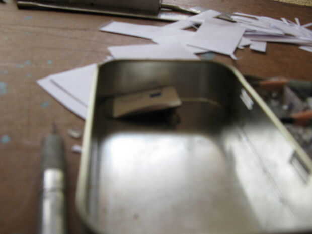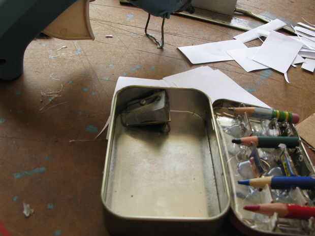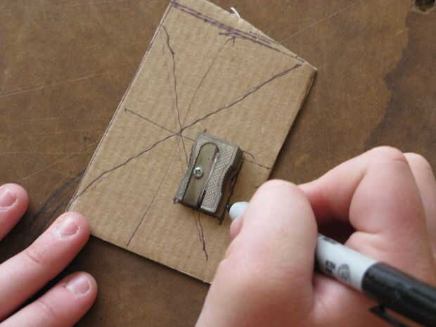 ahora será crear una rampa para el sacapuntas. Trace el afilador sobre algunos de cartón sobrantes, ahora corte el afilador trazado fuera del tablero de tarjeta. ahora cortar otra pieza en el tablero de tarjeta de 1/4 de size.this trazado de los sacapuntas se utilizará para hacer una rampa muy pequeña en el borde mismo de la parte inferior de la lata. pegamento caliente la pieza más corta de la rampa primero pegamento caliente el otro trazo más grande en el más pequeño pedazo de cartón como en el pegamento de picture.then el afilador en la parte superior de la rampa.
