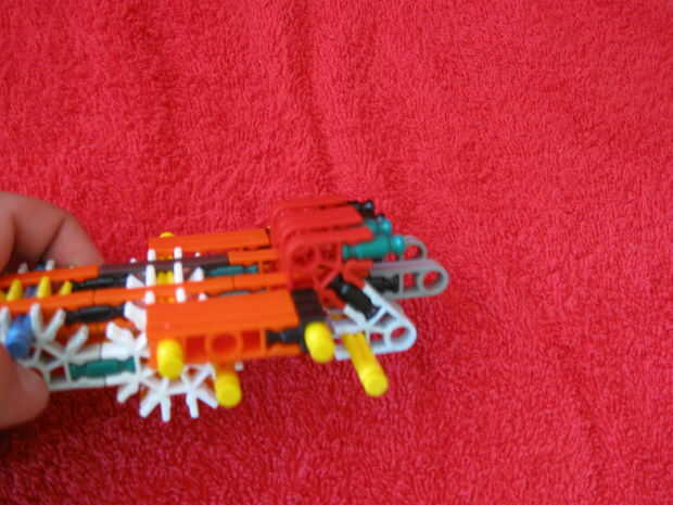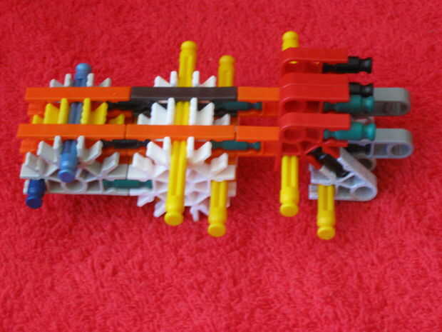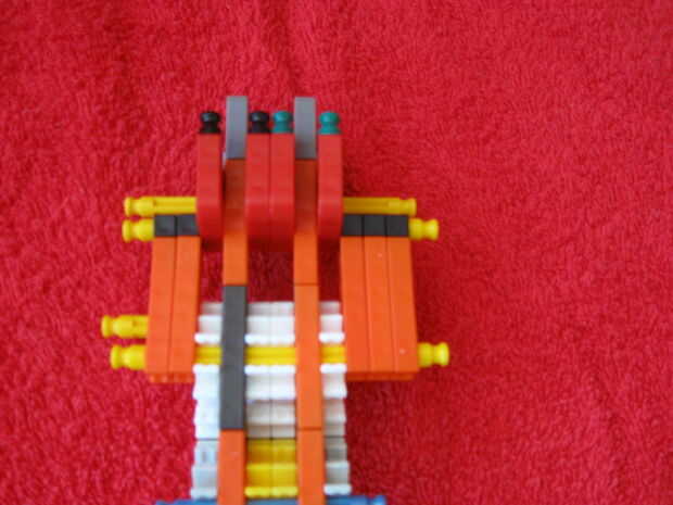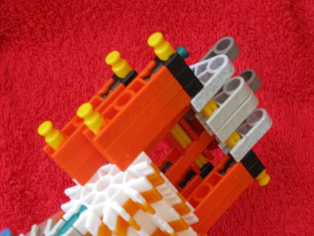 1. enganche la barra amarilla y sobre los copos de nieve y una barra azul en los amarillos.