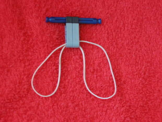 el clip de ellos en una barra azul. Pase un largo elástico a través de ellos...