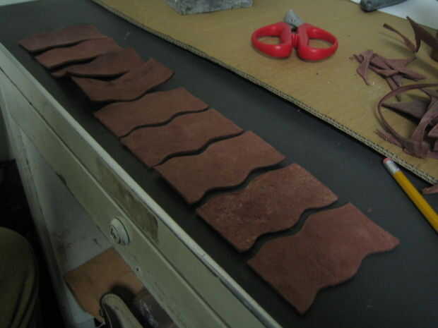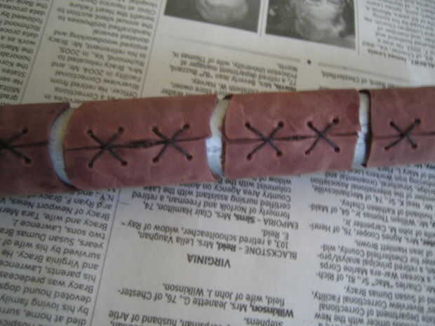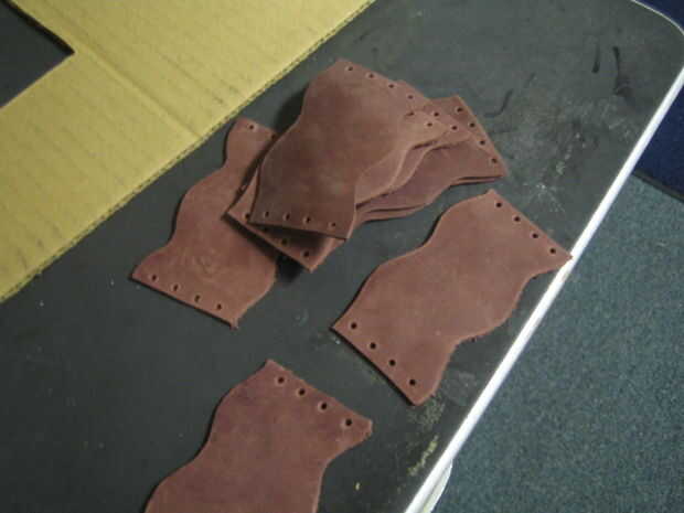 Después de todos ellos tenía cortado que perforados agujeros en ellos para poder coserlas. Utilicé un golpe de cuero, pero puede utilizar un punzón o un clavo o realmente cualquier cosa afilada. En cosí con una aguja grande y un hilo encerado. También puse pegamento debajo de ellos como cosí en para asegurarse de que permanecían en el lugar.