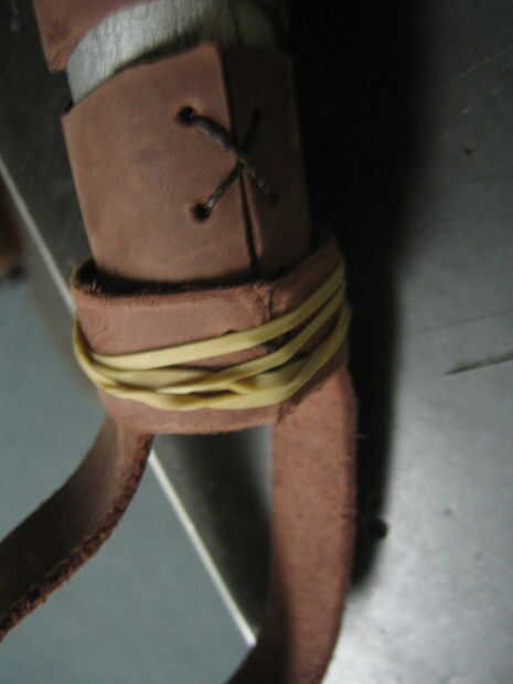 Para el toque final del mango até un lazo en el extremo. Corté una tira fina de cuero y con clavos muy pequeños viro cada extremo de la tira a lados opuestos de la espiga. Entonces yo cortar otra tira de cuero y envuelto alrededor de la culata del mango a la cubierta donde había até el lazo. Para fijarlo he utilizado el mismo método que utiliza para el resto de la empuñadura.
