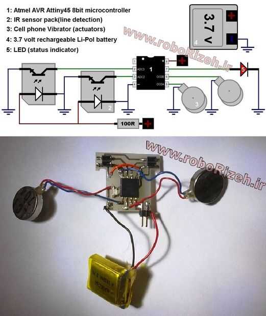 Mundo Bristlebot Vibrobot más pequeño RobotPor: Naghi Sotoudeh nscontrolwww.roborizeh.irDescripción del sistema de robot:-vibrador de teléfono móvil 2-AVR ATtiny45 microcontrolador-IR RC5 receptor para control remoto-Batería recargable NiMH-Indicador