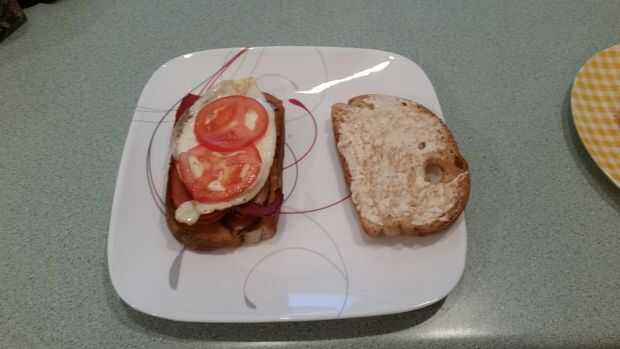- Poner el tomate en rodajas en la parte superior del huevo- Mantenga el tomate dividido de modo que hay una línea de centro definido que se ejecuta a través del centro del Sammy