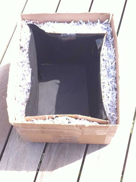 Ahora, con la segunda caja, cortar las aletas en el exterior. Después Ataremos los reflectores. Entonces, puso la primera casilla en la segunda. Ajustar para que haya un espacio proporcional de todo el camino alrededor de la primera caja. Entonces, en esa brecha, rellene todos los periódicos triturados. Rellene tantas como quepan en allí. Y luego más. Esos periódicos servirá como el aislamiento del horno. Más hará cocinar mejor.
