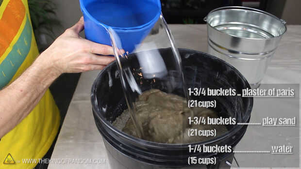 Llenar el cubo con agua, para darle un poco de peso, pero algo como arena o rocas funciona así. Como empuja el cubo en el centro, la mezcla se levanta hacia arriba, pero no derrama hacia fuera.